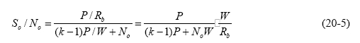 对于直接序列扩频系统来说,W为伪随机码的信息速率。式(20-5)给出了扩频通信中扩频解调处理对信噪比的改善情况,它决定了系统抗干扰能力的强弱,是扩频系统的一个重要性能指标。