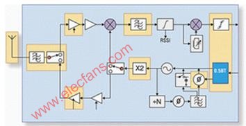 在图1所示的蓝牙结构中,接收器仅采用一次下转换,这类设计使用一个简单的本地振荡器,输出经过倍频,并在接收器和发送器间切换。FSK允许直接VCO调制,基带数据通过一个固定时间延迟且无过冲高斯滤波器,而脉冲整形仅用于发送器中,锁相环(PLL)可用采样-保持电路或相位调制器解除基带内的相位调制。通常中频相当高,以限制滤波器元件的物理尺寸,使中频远离LO频率,确保足够的镜像抑制。如果电平过高造成接收器输入过载,则应使用天线开关。
