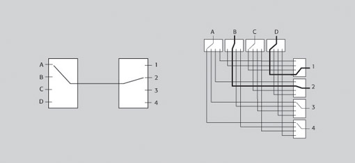 一系列复杂的开关拓扑在RF开关中得以采用。矩阵式开关可以实现每个输入与每个输出的连接。有两种类型的矩阵在微波开关架构中得以采用——blocking和non-blocking架构。一个blocking矩阵可将任意一个输入和任意一个输出进行连接,因此其他的输入和输出就不能同时连接。这对只需在一个时刻切换到一个信号频率的应用是一个有效的低成本方案,信号完整性也更好,因为有更少的继电器路径,特别是避免了相位延迟的问题。而non-blocking矩阵允许多个路径的同时连接,这种架构具有更多的继电器和线缆,因此灵活性更强,不过价格也更高。