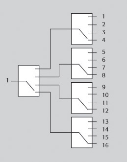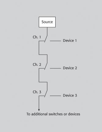 层叠开关架构是多位置开关的一种替代形式。它采用多个继电器将一个输入连接到多个输出。路径长度(同时决定了相位延迟)是由信号经过的继电器的数量决定的。