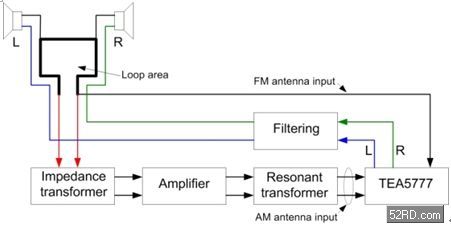 以下结构图显示两根地线(红色)用于将回路两端接入阻抗变换器。音频线(蓝色和绿色)连接到滤波阶段。该滤波阶段包括一个低通滤波器,以防止高于音频信号频率的信号耦合进入该天线。