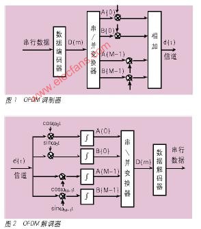 如图 1、2 中所示:在调制端,要发送的串行二进制数据经过数据编码器(如16QAM)形成了M个复数序列, 这里D(m) =A(m)-jB(m)。此复数序列经串/并变换器变换后得到码元周期为T 的M 路并行码(一帧),码型选用不归零方波。用这M 路并行码调制M 个副载波来实现频分复用。所得到的波形可由式(1)表示: