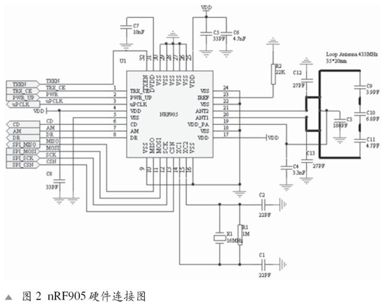 本系统采用的射频收发器为Nordic VLSI公司的nRF905, 工作电压为1.9~3.6V,工作于433/868/915MHz三个ISM频段,频段之间的转换时间小于650us。nRF905由频率合成器、接收解调器、功率放大器、晶体振荡器和调制器组成,不需外加声表滤波器。高抗扰GFSK调制,数据速率为50kbps,独特的载波监测输出,地址匹配输出,数据就绪输出。ShockBurstTM工作模式,自动处理字头和CRC(循环冗余码校验),使用SPI接口与微控制器通信,配置非常方便。此外,其功耗非常低,以-10dBm的输出功率发射时电流只有11mA,工作于接收模式时的电流为12.5mA,内建空闲模式与关机模式,易于实现节能。nRF905的硬件连接电路图如图2所示。