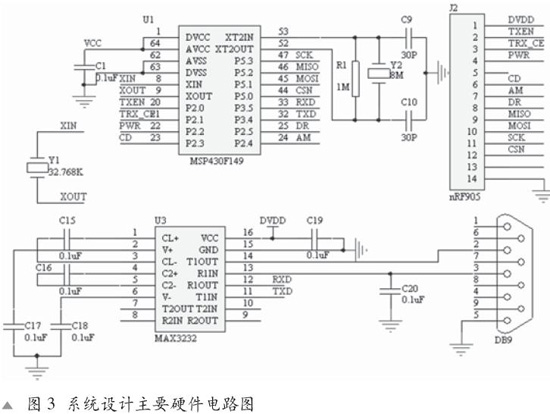 采用的微处理器为TI公司的MSP430F149,它是一种超低功耗的混合信号控制器,具有16位RISC结构,CPU中的16个寄存器和常数产生器使MSP430能达到最高的代码效率。单片机通过采用不同的时钟源工作可以使器件满足不同功耗要求,适当选择时钟源,可以让器件的功耗达到最小。外设主要有存储器、时钟模块、定时器、USART和A/D转换器等。此次设计主要用到了MSP430F149两个串口通信模块USART0和USART1,USART0作为UART使用,提供异步通信,通过MAX3232电平转换芯片提供RS-232接口和PC机进行通信,USART1作为SPI使用,提供同步通信,主要是和nRF905之间进行命令和数据通信。把MSP430F149的P2口作为一般引脚使用,与nRF905的其他引脚相连。对MSP430F149提供双晶振系统,低频晶振为32.768K,与微控制的XIN和XOUT相连,为RS-232接口提供频率支持,高频晶振为8M,和微控制器的XT2相连,为系统运行的主时钟。系统的整体设计相对较为简单,不过在此基础上可以实现遥测,无线抄表,工业数据采集,机器人控制等。发送和接收的硬件电路是一样的,系统设计主要硬件电路图如图3所示。