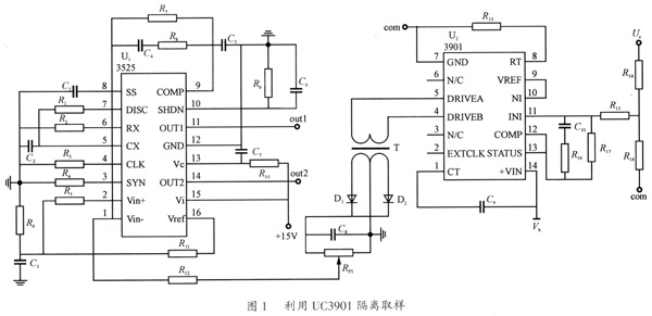 UC3901是一种专用于隔离取样的芯片,详细数据见文献;误差信号经过内部放大器放大后调制高频振荡器幅度,输出占空比为50%的高频调幅信号,该调幅信号经过变压器(或光电器件)隔离到低压端整流滤波后控制脉宽调制器(3525或其它控制器),原理如图l所示。