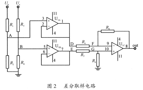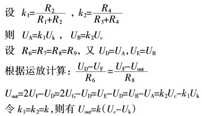 借助差分放大电路中将双端差分信号变换成单端信号的方法,可以将以阴极为参考的收集极电压转换为以地为参考的压差信号,原理如图2所示,R1、R2构成阴极分压取样电路,R3、R4构成收集极分压取样电路;图中Uk,Uc数值以地为参考。