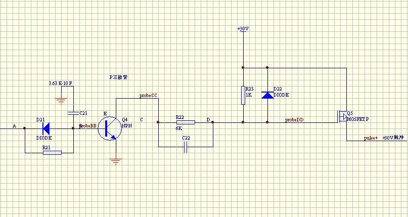 脉冲宽度调制电路,首先分析电路。脉冲是3uS/5V的,那么Q4常态是关闭的。工作时瞬间导通3uS。所以Q5应该是常态导通,瞬态关闭的。这和xbtxbt所说的好象完全不一样。所以初步分析,可能1:电路原理错了。可能2:电路图画错了。可能3:如杨真人的图所示,xbtxbt把输入信号说错了。