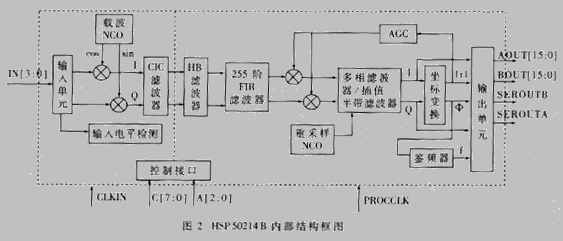 由于受微机运算速度的影响,若将采样的数据直接送计算机处理,实时性难以保证。为此我们采用美国Harris公司生产的专用可编程下变频器HSP50214B对采样数据做必要的预处理后再通过PCI总线送微机,其主要完成功能是将IF数据下变频成基带数据。HSP50214B包括以下功能模块:输入单元、电平检测、载波数字压控振荡器(NCO)、级联积分/梳状滤波器(CIC)、5个可选半带滤波器(HB)、255阶可编程FIR滤波器、自动增益控制(AGC)、重采样滤波器/插值半带滤波器、重采样NCO、坐标变换以及输出单元。其结构框图如图2所示。