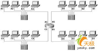 如图所示,A、B、C、D四个网络通过路由器连接在一起,现在我们来看一下在如图所示网络环境下路由器又是如何发挥其路由、数据转发作用的。现假设网络A中一个用户A1要向C网络中的C3用户发送一个请求信号时,信号传递的步骤如下: