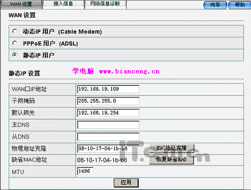 如果WAN口接出设备是动态分配IP,那应该选择动态IP用户,不过这种情况很少遇到,一般家庭都是才用PPPoE模式或者是静态IP的模式。要用到无线路由器拨号的用户,应该选择PPPoE模式,相应填入相应的ADSL用户名和用户密码。如果是固定IP接入到WAN口,则采用静态IP用户摸索,如果下图。