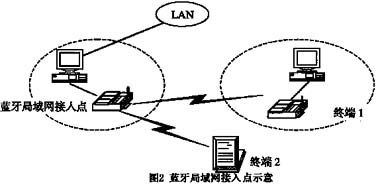 蓝牙局域网接入点是蓝牙应用模型中局域网接入模型(LAN Access Profile)的关键设备,其示意图如图2所示。它可使蓝牙终端随时随地无线上网,免去了连接网线的麻烦。