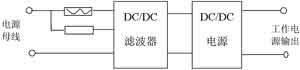 电源控制器中遥测变换电路使用的二次电源以母线电源为输入电源,工作电源采用DC/DC变换型电源。设计选用了成品INTERPOINT公司电源模块,电源输入端使用了该公司的EMI-461滤波器,保险丝与限流电阻并联保护措施,保护电路如图4所示。