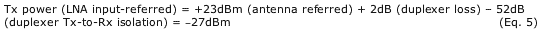 交叉调制干扰当一个很强的发射机泄漏信号出现在接收机的低噪放输入端时就会发生交叉调制。这一被调干扰和900kHz处的AMPS信号在低噪放中发生交叉调制产生三阶非线性产物,结果是在接收机中的给定射频信道中的噪声功率上升。即使接收机IP3主要是混频器的IP3,大多数的交叉调制还是发生在低噪放中,这是由于在低噪放和混频器之间有带通滤波器,发射机的泄漏到达混频器的输入端非常小4。 为了在接收机测试装置中包含这一影响,必须在接收机中注入CDMA反向信道调制信号。对蜂窝频段而言,发射功率注入到LNA输入的功率由式5表示:![]() 假定双工器发送与接收之间的隔离度为52dB,天线到双工器发射端口的损失是2dB。 采用CNR方法的测试实例图3是测试蜂窝频段CDMA接收机的阻塞的完整装置。同样的装置可用于PCS频段测试,但是干扰发射机的频偏和功率电平以及发射信号的功率电平必须按表1来相应设定。在这个测试装置中,我们使用CNR (载频噪声比)方法来测量阻塞。![]() 图3. 蜂窝频段单音阻塞测试装置 灵敏度定义为在95%的时间内误帧率(FER) ≤ 0.5%时的最小接收功率。在CNR测量中,我们注意到,在3GPP2标准的射频配置1中,业务信道的Ec/Ior 是-15.6dB,相对于9600bps的数据速率,业务信道的Eb/Nt = 4.5dB,处理增益是10log (1.2288Mcps/9600bps) = 21.072dB,由此可得式6: ![]() 因此,在1.23MHz信道宽度上要求能够解调CDMA信号的CNR是-1dB。在我们的测试装置中,我们使用3kHz的RBW,通过比较点频测试信号功率(250kHz处)和整个615kHz I通道带宽上总共的噪声功率来测试。因为给定的接收信号功率是-101dBm,而总共允许的噪声功率是 为了说明这个方法,参照Maxim的N-CDMA V4.1参考设计的测量,它使用一个内带VCO的零中频单片接收IC (MAX2585) (图4)。绿线表示在没有阻塞和发射信号时的给定信号(对给定信号,我们用一个偏移信道频率250kHz,-101dBm的单音来充当CDMA前向信道的调制信号)。蓝线代表阻塞和CDMA发信号同时打开时噪声的上升。下列步骤概括了测试装置: ![]() 图4. 由单音阻塞和CDMA发射信号造成的噪声上升