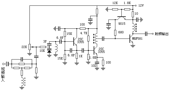 图中振荡线圈用Φ1mm漆包线在Φ3mm钻头上绕3匝适合400多兆赫兹,绕4匝适合300多兆赫兹,当然也不是绝对的,因为振荡频率和其他电路参数也有很大关系。不用接发射天线,这个简单的单管调频电视发射机在开阔地能有百米以上的发射距离,但它却不能算是实用的调频电视发射机,因为其一是发射频率易受外界干扰,其二是输出太小。按照下图所示加上一级放大,就变成一个具有一定实用性的小功率调频电视发射机了。