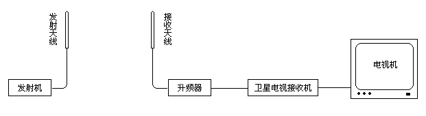 老式的模拟卫星电视接收机频率范围为950-1450MHz,后来扩展为950-1750MHz,再后来由于Ku频段的使用和双本振高频头的使用又扩展为800-2250MHz,但是无论如何也没有往800MHz以下扩展。这些模拟卫星电视接收机在社会上保有量很大,如今几乎全部闲置,在这里很有利用价值,只要将实验选用的频率升到卫星机的频率范围内,便可很好地完成信号解调,如下图所示。