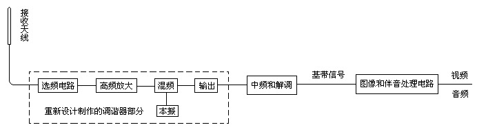 由于这里一定要采用较低的频率,目前市场上很难有这样的接收器材,因此有时为系统制作专用接收器材也是很有必要的,这里采用利用过去淘汰的卫星电视调解器的方法。调解器的全称是调谐解调器,调谐器部分不用,只用第二中频和解调部分,见下图所示。