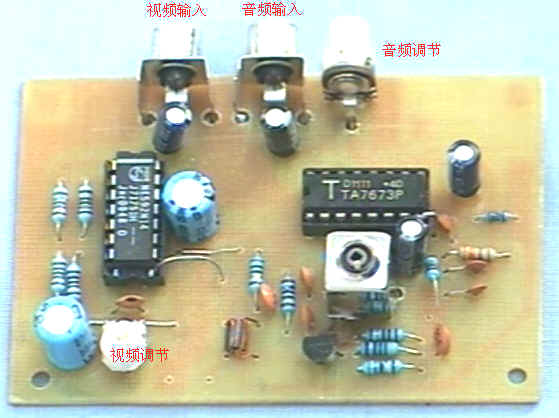 这部分电路非常简单,一共用了两块芯片,一块是视频处理专用芯片NE592,另一块是电视调制专用芯片TA7673,这里只用的它的伴音调制部分,两块芯片用的全是标准电路,就不在这里罗嗦了,成品见下图。
