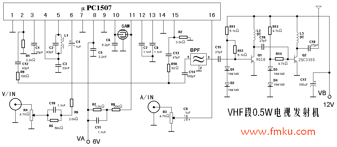 整机电路见图1所示。IC1是TV射频调制器专用电路,选用 同频点的SAW振子,可将音视频信号调制成TV1~12频道的RF信号。IC1输出的RF(射频)信号经过滤波网络A1(见图2)滤除残边信号及次波信号之后,由C15耦合到射频功率放大电路进行放大发射出去。SAW振子是一种性能与晶振相当的声表面波振荡器,其频率稳定系数虽然比不上晶体振荡器,但它具有一个频点的特性,不会产生次波等优点,如选用5频道的SAW振子,不用调整μPC1507就会输出5频道的射频信号。本机采用的就是5频道SAW振子,由于TV5伴音正好落在87~108MHz波段之内,因此,可用调频收音机作为节目监听。