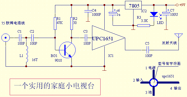◆工作原理 电路如图下图所示: 这个电路的工作原理是射频信号经75欧姆射频电缆送至有C1、 L1、C2 构成的高通滤波器,将低于45MHZ的频率滤除,然后在经三极管9018等组成的前置放大 器放大后由电容C3送至upc1651进行功率放大,其输出信号经6英吋左右的鞭状天线发射 出去。7805等构成稳压与电源指示为upc1615提供5V的供电。 |