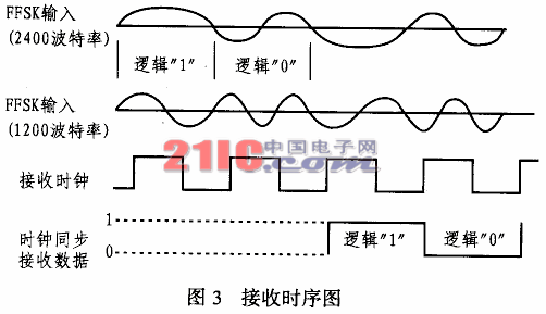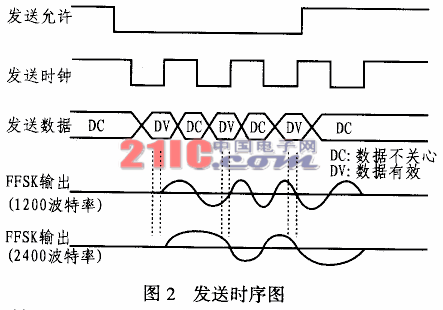 TXEN为发送使能控制端口,当低电平发送使能后,在时钟信号TxSYNC的同步下,TXDATA数据线上的信号将依次被采样,同时经过调制即可在TxSIGNAL引脚输出调制后的FFSK信号。在1200bps下,该系统可将高电平“1”转换为1200Hz的正弦波,而将低电平“0”转换为1800Hz的正弦波,并由TxSIGNAL端口输出。其发送时序如图2所示,Tx-DATA引脚信号将在时钟信号TXSYNC的上升沿被采样,因此,TXSYNC的上升沿必须有效并且保持稳定。设计程序时,应该在时钟信号的下降沿依次串行输出要发送的数据。拉高TxEN将使发送电路进入节能状态,这时TXSYNC将输出逻辑高电平,TxSIGNAL进入高阻态。TxEN由内部上拉为VCC。
