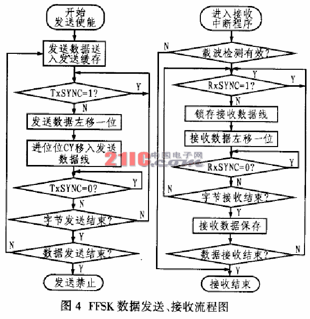 该MODEM的软件设计主要包括FFSK发送程序和FFSK接收程序,其程序流程图如图4所示。发送FFSK数据时,首先需要拉低发送使能端口TxEN,接着检测时钟线(TxSYNC)?并在每一个时钟下降沿移位输出一位数据,一直到数据全部发送完成,然后拉高发送使能端口。至此,FFSK发送数据结束。