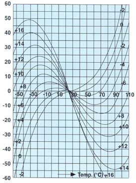 | 根据晶振的不同使用要求及特点,通常分为以下几类:普通晶振、温补晶振、压控晶振、温控晶振等。安装晶振时,应根据其引脚功能标识与应用电路应连接,避免电源引线与输出引脚相接输出。 在测试和使用时所供直流电源应没有足以影响其准确度的纹波含量,交流电压应无瞬变过程。测试仪器应有足够的精度,连线合理布置,将测试及外围电路对晶振指标的影响降至最低。 AT切型晶体的频率温度特性曲线如下: |