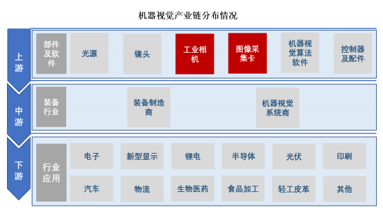 机器视觉行业内上游企业专注于与机器视觉相关的软硬部件的生产与研发。其中,硬件包括光源、镜头、工业相机、图像采集卡以及控制器及配件等;软件包括图像处理软件以及底层算法平台等构成的机器视觉软件及算法。