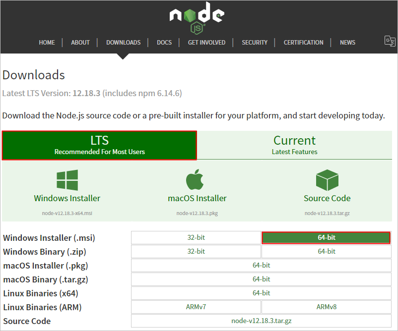 登录 Node.js官方网站,下载 Node.js 软件包。请选择 LTS 版本,Windows 64 位对应的软件包。