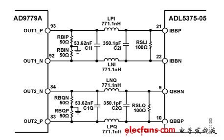 ADL5375用于以最少的元件与ADI公司TxDAC®系列转换器(AD97xx)实现接口,其基带输入要求采用500 mV的直流共模偏置电压。AD9779A每路输出的摆幅为0 mA至20 mA,因此在各DAC输出处配置一个50 Ω接地电阻,便可提供所需的500 mV直流偏置电压。仅配置四个50 Ω电阻时,每个引脚上的电压摆幅为1 V峰峰值,这使得每个输入对上的差分电压摆幅为2 V峰峰值。