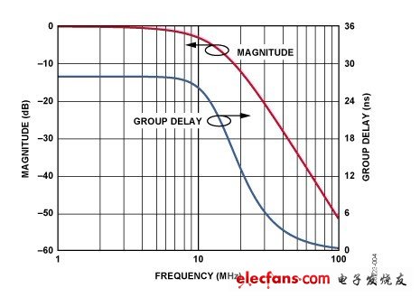 图3为一个模拟滤波器示例,它采用一个三阶椭圆滤波器,其3 dB频率为10 MHz。输入与输出阻抗匹配有助于简化滤波器设计,因此所选分流电阻为100 Ω;对于0 mA至20 mA DAC满量程输出电流,该电阻可产生1 V峰峰值差分交流摆幅。此滤波器的模拟频率响应曲线如图4所示。在实际应用中,用标准值元件,再配合I/Q调制器的输入阻抗(2900 kΩ,与几pF输入电容并联)会略微改变其频率响应特性。
