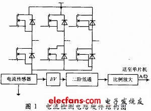 将霍尔传感器LA28置于母线负侧到地之间进行电流检测,LA28将检测到的初级电流按1 000:1的比例进行缩小,得到次级电流,次级电流经过I/V电路之后转化为方便A/D(模/数转换模块)采集的电压量,但是I/V输出的电压信号含有丰富的PWM斩波的高次谐波分量,所以如果直接送单片机的A/D口,会检测不到电压信息,因此需要加信号调理电路,即将I/V电路得到的电压送入巴特沃思(Butterworth)二阶低通滤波器进行低通滤波。经过低通滤波之后可以将高次谐波分量滤除,进而得到直流分量,同时为了便于A/D口采集,将滤波后的小电压信号进行比例放大,之后送入A/D口进行检测。这个硬件电路示意图如图1所示。