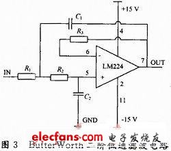 图3给出了二阶低通滤波器的设计方法。实际设计时,使R1=R2,C1=2C2,可以实现-40 dB/10倍频的频率响应。其截至频率的计算公式为: