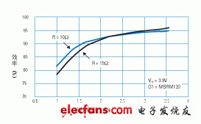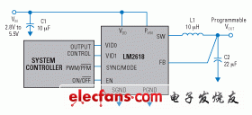 图 3 为 LM2618 的典型应用电路,而图 4 则显示这款芯片采用脉冲频率调制 (PFM) 模式进行整流时的典型效率曲线。美国国家半导体即将推出可输出更低电压的降压转换器以供选择。LM2608/12/18 三款芯片都内含数字模拟转换器,只需将逻辑信号输入 VID 管脚,便可设定输出电压,因此无需装设回馈电阻分压器,确保脉冲频率调制模式的输出电压纹波可以保持在较低的水平,也确保电压可以灵活转变,而这正是智能型电源管理系统需要具备的重要功能特色。此外,这三款芯片还有其他的内置功能,其中包括内部补偿、低停机电流 (典型值为 0.02mA)、频率同步、电流限幅保护、过热停机保护、内部软启动以及输出电压过高保护。