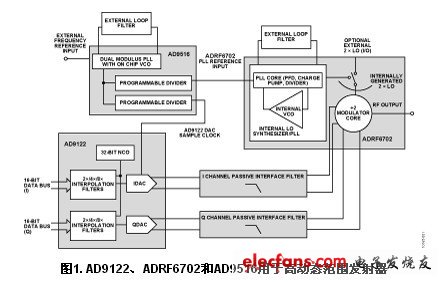 图1. AD9122、ADRF6702和AD9516用于高动态范围发射器