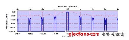 基带信号通过数个步进一直到达RF发射频率。该信号在离散(采样)域开始并由DAC合成至模拟域。这一步导致DAC产生图像和失真积。如图2所示,没有失真的理想DAC将会产生多幅基带信号图像,随后必须在调制前加以滤波。使用诸如AD9122系列的插值滤波器可以抑制大多数图像能量,但仍需要在DAC和调制器之间配置一个模拟接口滤波器。不过需要权衡取舍DAC插值和模拟滤波器的阶数。DAC插值速率越高,所需的模拟滤波器阶数越低,反之亦然。作为示例,图3显示了使用4倍插值时的DAC输出频率波形。