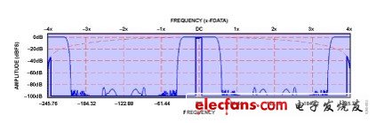 图3.使用4倍插值的DAC输出频谱,蓝色细线表示DAC插值转移函数