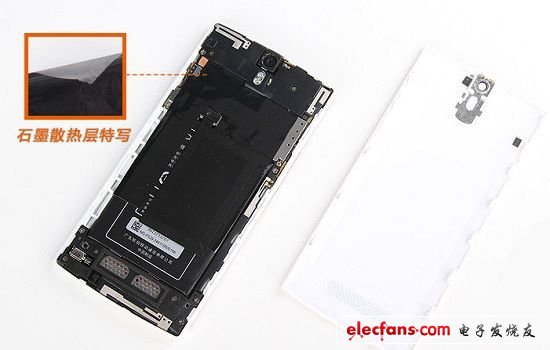 拆开后盖,首先看到的是覆盖在电池上的石墨散热层。从小米1代开始,广泛使用。高通四核处理器的发热量不小,采用散热层很有必要。