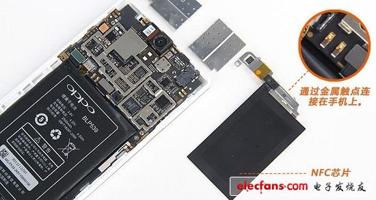拆解电池之前,发现电池上覆盖一张黑色贴片,其通过金属卡口卡在主板上,和主板的金属触点进行接触。即NFC芯片。附赠两个NFC智能标签。