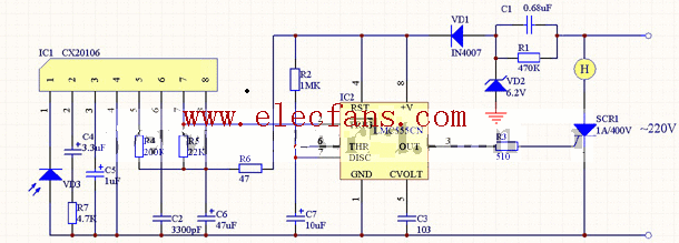 电路原理: 电路由红外接收器、单稳态延时电路和可控硅电路组成,如图,红外接收器电路由CX20160A 及光电二极管VD组成。在该电路中,IC的中心频率已被带通滤波器中心频率设置电阻R设置为f0=40khz,这对于大多数红外遥控发射器基本都适用。当光电二极管VD接收到来自发射器的发射信号后,IC的输出端7脚输出低电平。单稳态延时电路中,由555电路与RP、C组成脉冲启动式单稳态触发器,由负脉冲或低电平通过2脚触发,使其翻转。平时,由于IC的7脚输出高电平,IC的3脚输出低电平。当IC的7脚输出低电平时,通过2脚使IC2翻转,3脚变为高电平。这一高电平通过R将可控硅VS触发,使其导通,电灯亮。单稳态电路被触发翻转后进入暂稳态,这时电源通过RP向C充电,C充电所需的时间便是单稳态触发器的延时时间,这个时间TD=1.1RPC5。由于采用了可调电阻RP,单稳态电路的暂稳时间可根据需要进行调整。当C5充电使其正端电压升至2VDD/3时,单稳态电路翻转,IC的3脚恢复低电平,双向可控硅VS关断,电灯熄灭。 元件的选择与制作: VD2应该用6.2V的稳压二极管,SCR1采用1A/400V的单向可控硅或双向可控硅,其它元件无特殊要求。 安装与调试: 元件安装: 电阻、可调电阻、电容、MIC、三极管、电感L、IC 调试方法: 元器件安装无误后,通电进行调试。调试主要分两部分,一是由555构成的单稳态延时电路。通电调试先测量IC555第4、8脚与1脚之间的电压值应该为6V,电压有变时,应检查VD1、VD2、C1、R1,重点检查VD2有没有损坏,在检查这部分电路时要特别小心,要不你会给220V的交流电给电倒。调试555单稳态延时电路时,用表笔碰接一下IC2的第2脚,这时电灯H就会点亮。如果不工作,检查IC2的电路是否有错误,其中R2、C7的数值决定延时时间的长短。 第二部分是IC1 CX20106构成的红外接收电路。红外信号从IC1第1脚输入,由第7脚输出。其中R4为带通滤波器中心频率的设置电阻,通过改变其阻值可以改变接收器的接收频率。C4、R7是决定放大增益,IC1的总增益被设计为77"79dB,在此增益下IC1第7脚输出的脉冲幅度约为3.5"5V。C2为积分电容,其容量一般取330PF。C2较大时,虽然可使抗干扰能力提高,但同时会使输出脉冲的低电平持续时间加长,造成遥控距离变短。