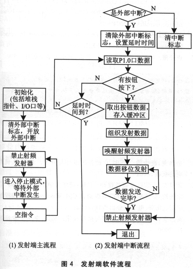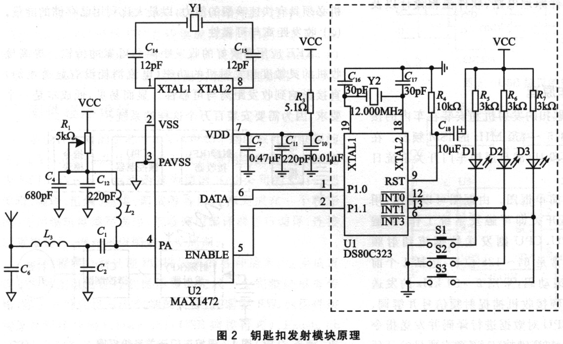 DS80C323的功能是利用其外部中断对按钮进行扫描,并将扫描的结果加密编码,通过P1.O送给发射器的数据端DATA。DS80C323的P1.1控制发射器的唤醒。