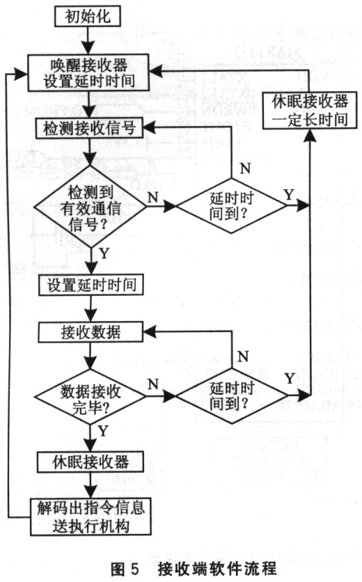 按所处理任务的不同,接收模块分为三种工作状态:唤醒与休眠交替的监听状态、接收数据的状态和处理接收数据的状态。接收系统应始终处在间歇休眠的状态,以监听外来的信息。当收到有效的通信命令后,触发系统接收数据。数据接收完毕后,对数据进行相关的处理,并有执行机构完成相应的操作,而接收系统则重新进入监听状态。
