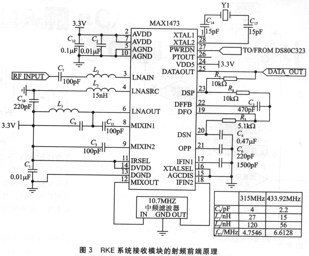 工作在300~450 MHz频段,具有一114 dBm的高灵敏度、高于50 dB的镜像载波抑制。这款芯片在关断模式下电流消耗低于1.5μA,在接收模式电流消耗为5.2 mA。MAXl473可接收最高达100 kbps的数据速率,从关断模式到有效数据输出的过渡时间小于250 μs。MAXl473包含一个一级自动增益控制(AGC)电路,在射频输入信号电平大于一57dBrm时,可降低低噪声放大器(LNA)35dB的增益。接收器使用带有接收信号强度指示(RSSD的10.7 MHz中频滤波器,带有集成压控振荡器VCD的片上锁相环(PLL)以及基带数据恢复电路。MAXl473仅需很少的外围元件即可构成RKE系统接收模块的射频前端,如图3所示。