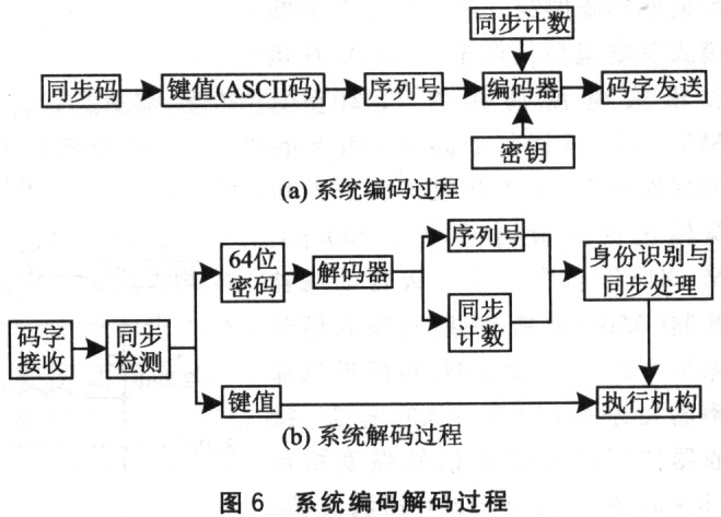 解码过程如图6(b)所示。解码电路接收到数据包后,将键值与密文分开,并将密文用密匙解密后还原为序列号和同步计数值,并在核对序列号及同步计数值后依照键值驱动相应的执行机构。