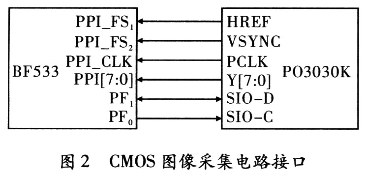 本系统采用Pixelplus公司的P03030K图像传感器完成图像采集功能,P03030K输出30万像素图像,支持多种输出模式和输出数据格式,此处采用QVGA输出模式和YUV4:2:2输出数据格式。P03030K与BF533的PPI口相连接,连接方式,如图2所示,P03030K产生HREF,VSYNC,PCLK这3种同步信号,分别为行同步输出信号、场同步输出信号和输出像素时钟。Y[7:0]为P03030K输出的图像数据信号。BF533使用GPIO的PF0和PF1模拟I2C总线协议,从而实现对P03030K内部寄存器的读写操作。