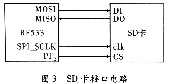 本系统采用SD卡存储压缩编码后的视频数据,SD卡有两种工作模式:SDIO模式和SPI模式。由于BF533支持SPI接口,故采用SPI模式。BF533的SPI接口数据传输速率最快可达到系统时钟的1/4,按系统时钟为118.8 MHz进行计算,SPI的最高数据率可达到29.7 MB/s,考虑到视频流数据量较大,采用双缓冲机制进行存储,能够满足系统要求。SD卡接口电路,如图3所示。