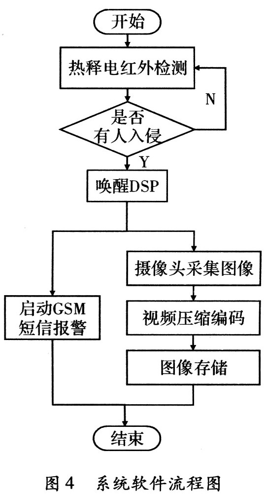 系统软件可分为视频采集及压缩程序、GSM短信报警程序和图像存储程序3部分,软件流程图,如图4所示。