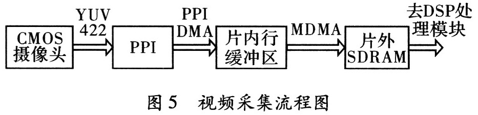DSP通过I2C接口完成对P03030K图像传感器的初始化,并设置相应的寄存器完成对工作模式、数据输出格式、分辨率、亮度和色度等的设置。P03030K与DSP的PPI口相连,输出图像数据以DMA方式传输到SDRAM中存储,本系统采用乒乓缓冲区的方法传输数据,在内存中开辟两个缓冲区,使用两个头尾相连的描述符链表控制PPI DMA一次传输数据到两个缓冲区中。DMA每采集完一行图像数据之后就产生一次中断,在中断服务程序中使用存储器DMA将数据搬移到片外SDRAM,等待DSP对其进行MPEG-4压缩处理。视频采集流程图,如图5所示。