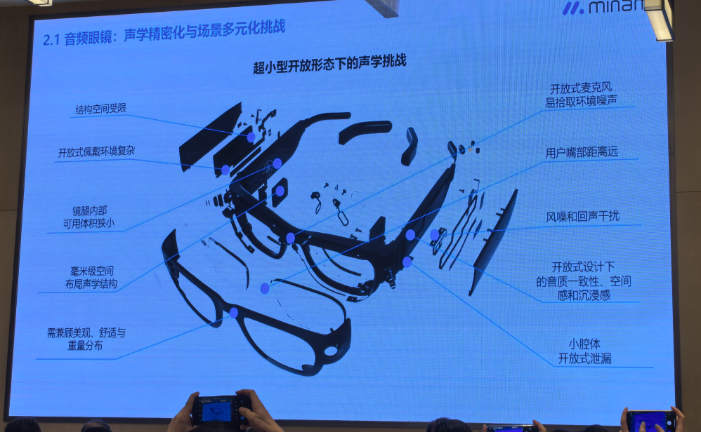 音频眼镜面临超小型开放形态下的声学挑战,包括开放式麦克风易拾取环境噪声、毫米级空间布局声学结构等。拍摄眼镜则面临影像微型化与功耗的挑战。AR光波导眼镜则需要考虑