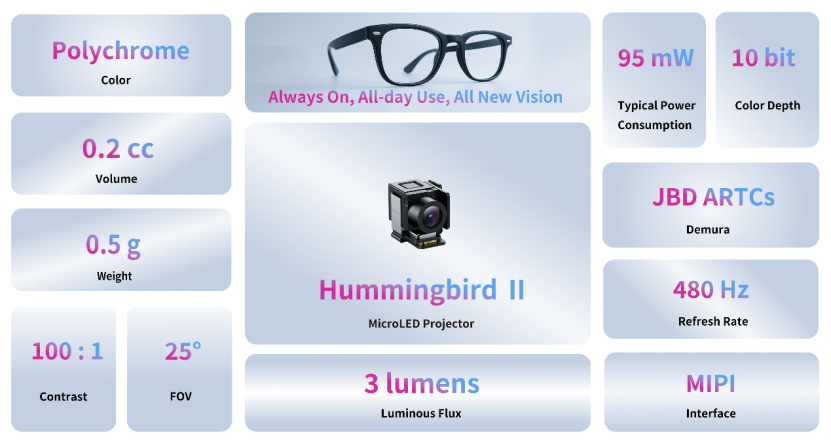 JBD公司表示:“蜂鸟Ⅱ是我们在消费级AR领域的一项关键突破,它将彩色显示融入极致尺寸之中,延续了JBD在MicroLED光引擎小型化、低功耗、高亮度方面的领先优势。依托JBD在近眼显示领域的不断创新,蜂鸟Ⅱ为轻量化全彩AR智能眼镜打开了全新增长曲线。”