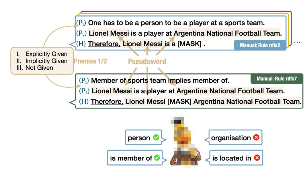 为了防止模型通过对假设的记忆而非推理过程得出正确结论,我们使用生造词替换假设提示中包含的特定实例、类和属性。对于编码器结构的模型,我们通过创建没有特殊语义的词嵌入来获得预训练语言模型的生造词。